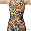 チェッカー柄の上に花やアルファベット、 プルート の足跡やフードボウルが可愛く描かれており、ポップで楽しいカラーリングが特徴。