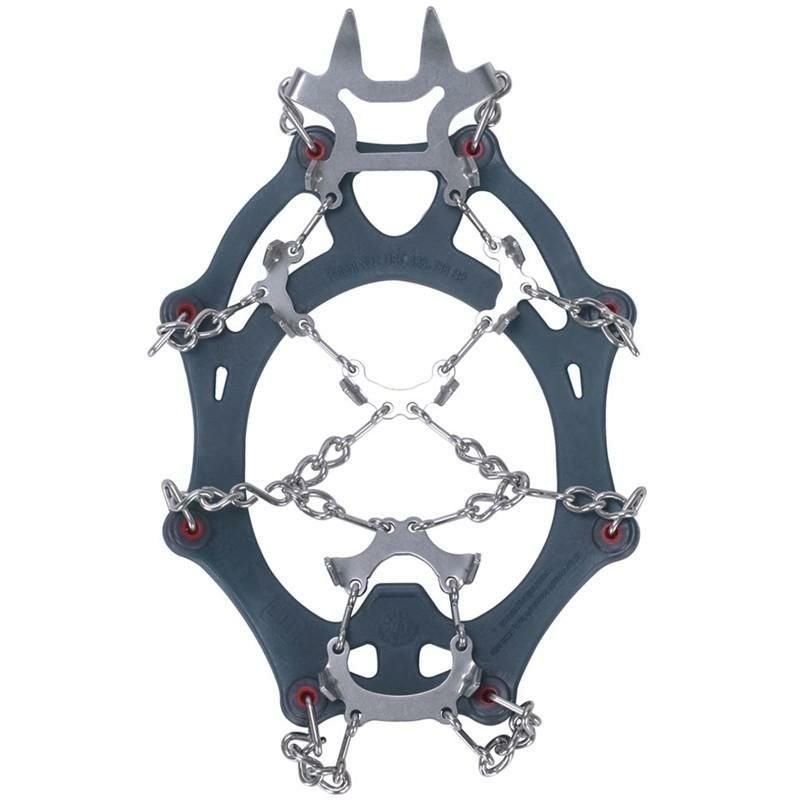 中間部の6本爪と、かかと部の4本爪が雪氷面へしっかりと喰い込む。